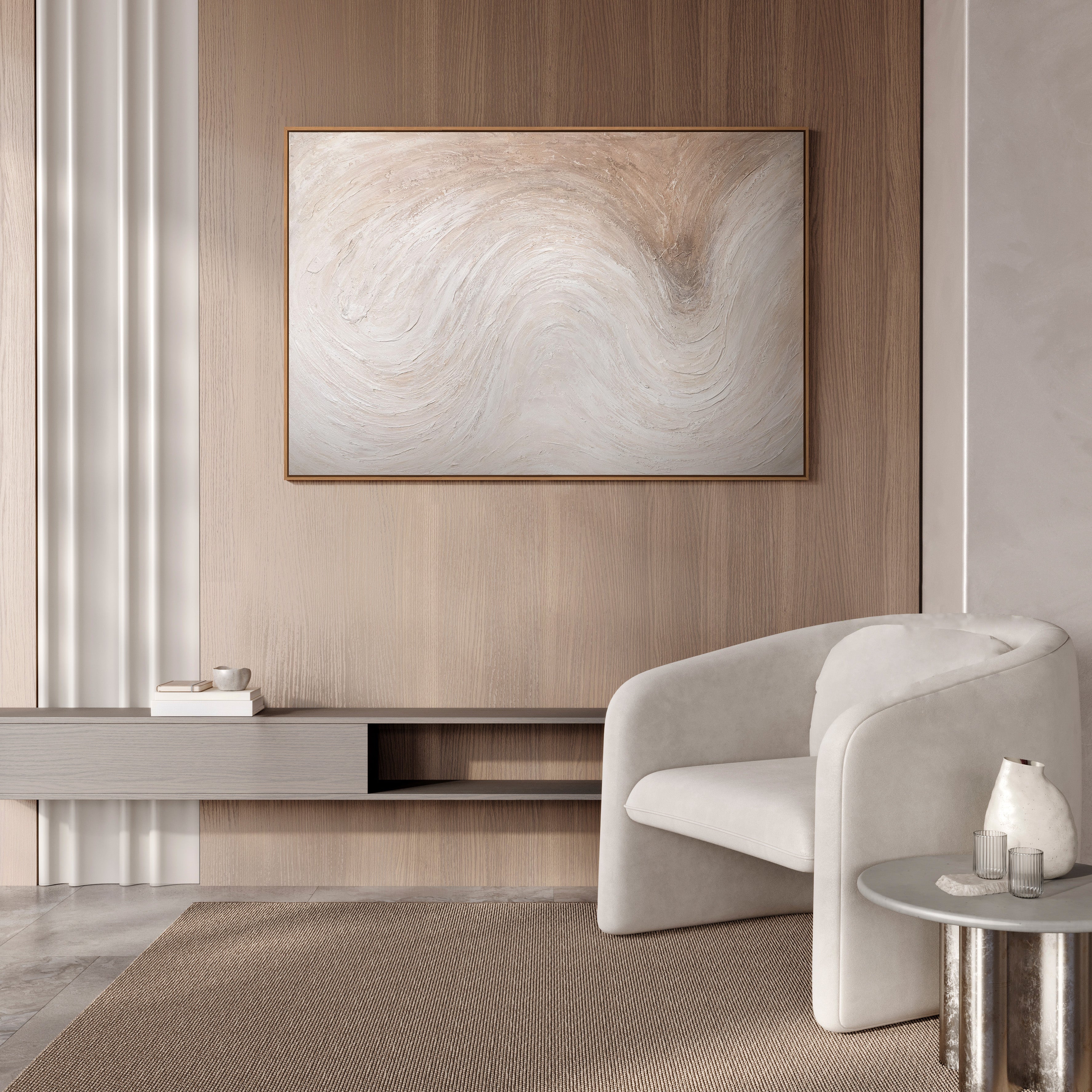 « Flux de lumière » est une peinture acrylique abstraite aux mouvements doux et fluides, dans une palette de couleurs naturelles et lumineuses, mêlant crème, beige et tons sable chauds. La texture de la surface crée une profondeur et un dynamisme apaisant, évoquant la lumière, l'air et le mouvement lent.